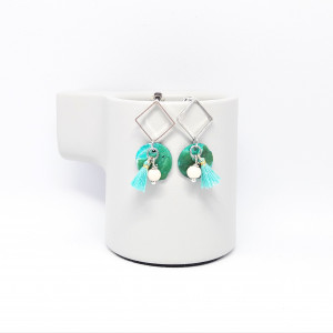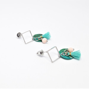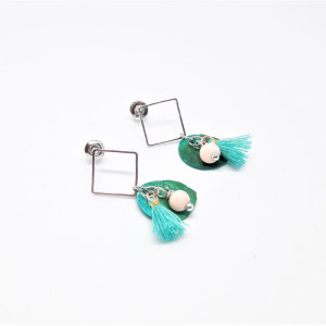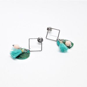 Mikrochwościk turkusowy. Kuleczki szklane powlekane w kolorze różowo-brzoskwiniowym. Zawieszka z masy perłowej w kolorze szmaragdowym. Sztyfty geometryczne w kształcie kwadratów w kolorze platyny, z mosiądzu, antyalergiczne