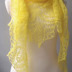 Chusta zrobiona ręcznie na drutach z mieszanki wełny,moheru i akrylu w kolorze cytrynowym.Ażurowy wzór w piękne liście dodaje chuście elegancji. Wymiary ; szerokość 200cm, długość 95cm. Prać ręcznie w temperaturze 30 stopni, suszyć na leżąco.