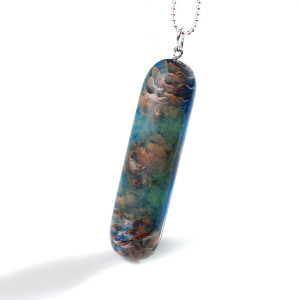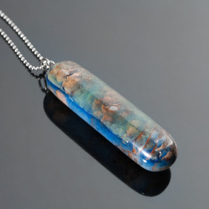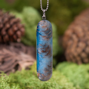 Wisior wykonałam z żywicy i szyszek. Wisior stanowi ciekawą kompozycję trzech szyszek zatopionych w niebieskiej i zielonej żywicy. Można go nosić dwustronnie, w zależności od potrzeb. Całość wykonałam ręcznie, wypolerowałam na wysoki połysk. Wysokość wisiora 65 mm, szerokość 17 mm, grubość 14 mm. Długość łańcuszka ze stali szlachetnej 70 cm. Wisior jest niepowtarzalny, może stać się świetnym prezentem dla ukochanej osoby.