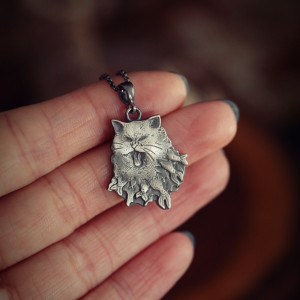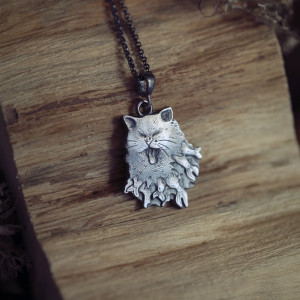 Kot z rybami ukrytymi w futerku jest jednym ze zwierzaków spod znaku marki Cztery Humory. Wisiorek powstał według autorskiego projektu widocznego na zdjęciu. Srebro pokryto oksydą, nadającą mu stalowo - szary odcień i przetarto dla wydobycia szczegółów zawieszki.