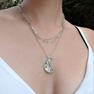 Sporych rozmiarów wisior w kształcie księżyca zawieszony na długim łańcuszku z okrągłymi ogniwkami z kolekcji BezKornika.