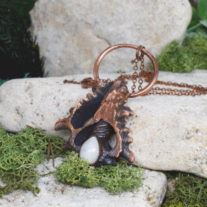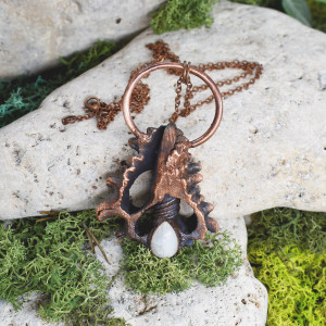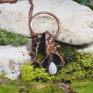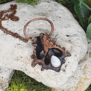 Ręcznie wykonany wisior z kamieniem księżycowym i plastrem muszli Murex Ramosus. Oprawa wykonana z miedzi metodą elektroformowania, patynowana.