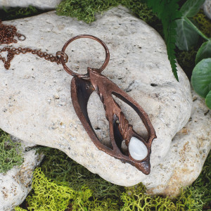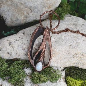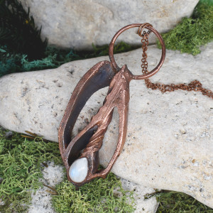 Ręcznie wykonany wisior z plastrem muszli zwójki i kamieniem księżycowym. Oprawa wykonana z miedzi metodą elektroformowania, patynowana.
