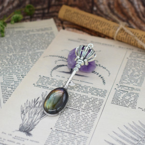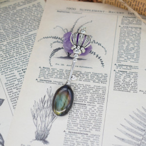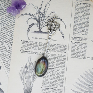 Ręcznie wykonany wisior z labradorytem o zielono-fioletowym ogniu. Oprawa wykonana z miedzi i cyny, patynowana, przedstawiająca kluczyk z koroną.