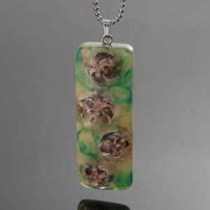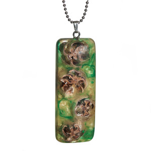 Wisior wykonałam z żywicy i szyszek modrzewia. Wisior stanowi ciekawą kompozycję czterech szyszek zatopionych w zielono-beżowej żywicy. Całość wykonałam ręcznie, wypolerowałam na wysoki połysk. Wysokość wisiora 54 mm, szerokość 20 mm, grubość 10 mm. Długość łańcuszka ze stali szlachetnej 65 cm. Wisior jest niepowtarzalny, może stać się świetnym prezentem dla ukochanej osoby.