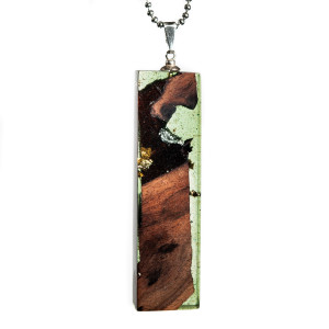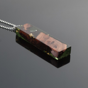 Wisior z transparentno-zielonej żywicy i drewna.