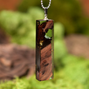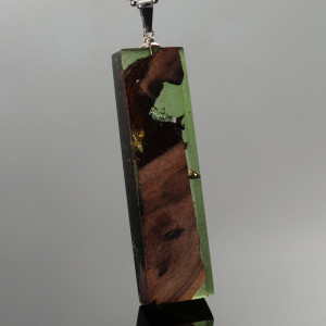 Wisior wykonałam z żywicy i egzotycznego drewna. Drewno wcześniej stabilizowałam w specjalnej żywicy, następnie łączyłam z barwioną żywicą epoksydową. Dodatkową ozdobę stanowią złote i srebrne płatki. Całość wykonałam ręcznie, wypolerowałam na wysoki połysk. Wisior jest w kształcie prostopadłościana, max wysokość 55 mm, max szerokość 15 mm, grubość 7 mm. Długość łańcuszka ze stali szlachetnej 65 cm. Wisior jest niepowtarzalny, może stać się świetnym prezentem dla ukochanej osoby.