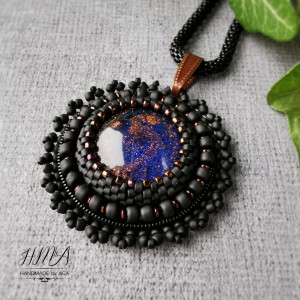 Jedyny w swoim rodzaju ręcznie robiony okrągły wisior z ręcznie odlewanym, niepowtarzalnym kaboszonem, opleciony koralikami i wykończony koralikową pikotkową koronką, zawieszony na czarnym metalowym łańcuszku o okrągłym przekroju. Z tyłu podszyty miękkim czarnym aksamitem.