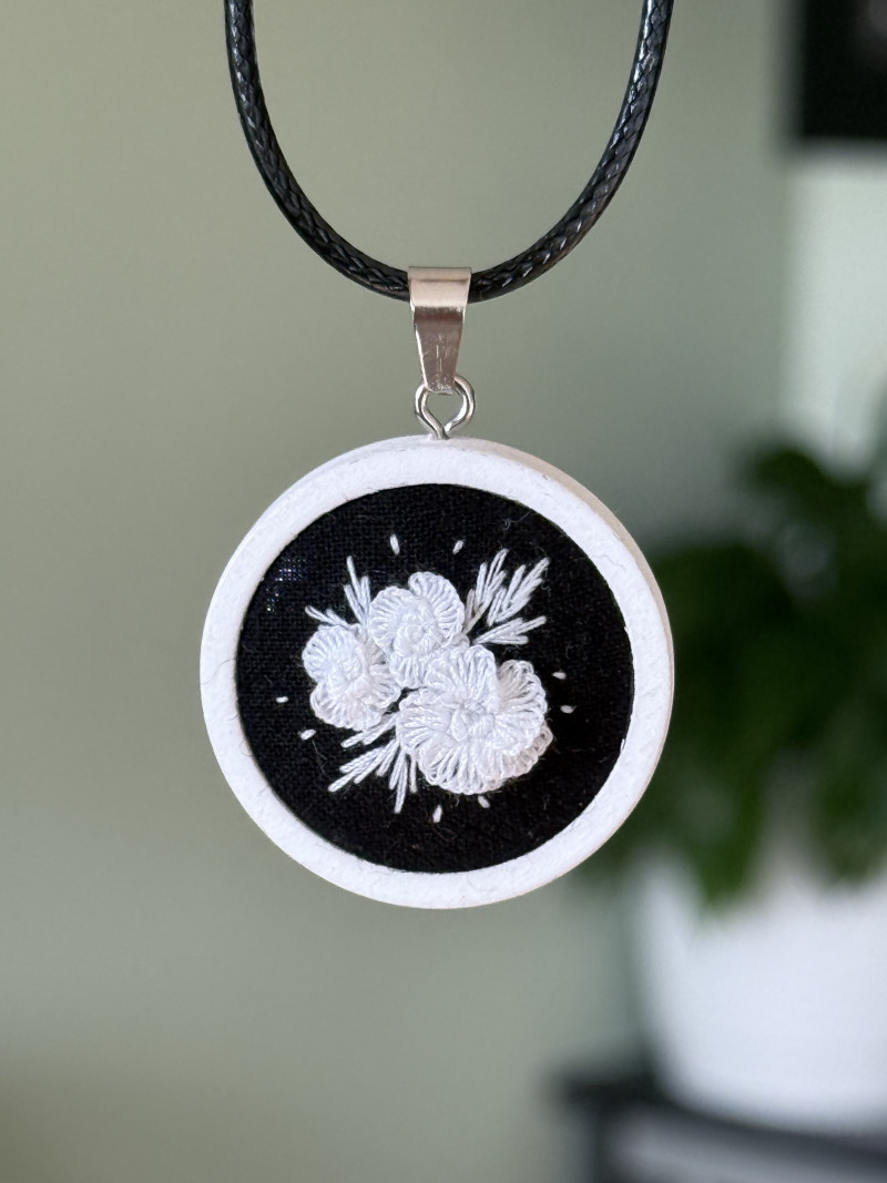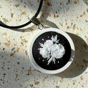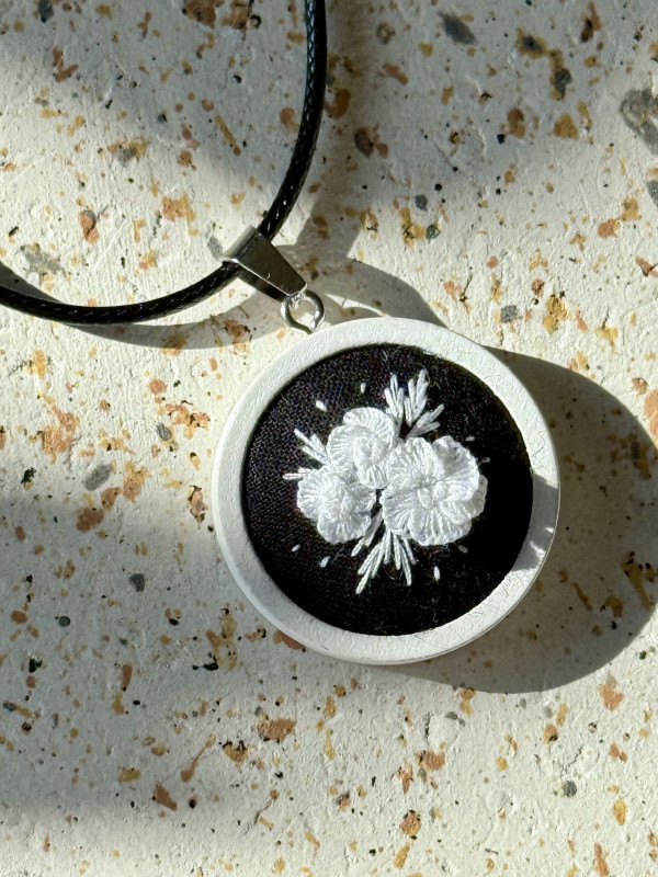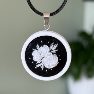 Podkreśl swój styl niezwykłą ozdobą! Ten wyjątkowy naszyjnik z ręcznie haftowanym motywem kwiatowym to esencja subtelności. Na czarnym tle pięknie kontrastuje biały haft z cienkiej nitki przedstawiający kwiaty, które symbolizują delikatność i harmonię.
