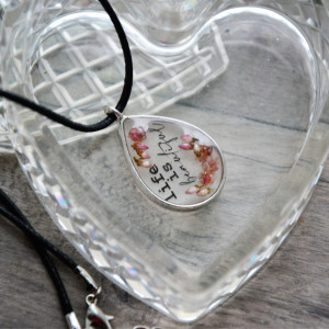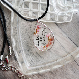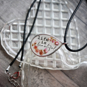 Oryginalny wisiorek z napisem "LIFE is beautiful". Śliczny, delikatny kwiatowy wisiorek został wykonany ręcznie. Kwiaty starannie ułożone a następnie zalane bezbarwną żywicą z napisem. Dzięki temu powstał wyjątkowy wisiorek zawieszony na naszyjniku ze sznurka.
