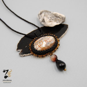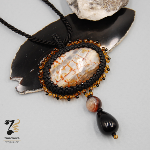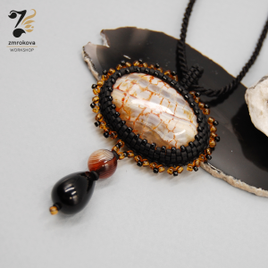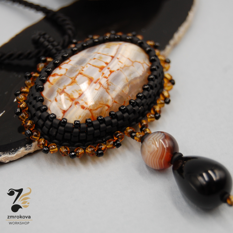 Wisiorek wykonany z koralików Toho, agatów, czarnego onyksu, z tyłu podszyty naturalną skórką. Sznurek z metalowym zapięciem (może nie być antyalergiczne).
