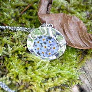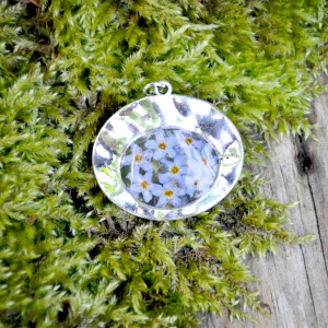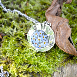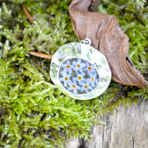 Śliczny, delikatny kwiatowy wisiorek został wykonany ręcznie. Zawieszka jest wykonana z żywicy i prawdziwych suszonych kwiatów niezapominajki. Kwiaty starannie ułożone a następnie zalane bezbarwną żywicą. Żywica zatrzymuje piękno ślicznych kwiatów i będą cieszyć swoim wyglądem przez lata. Dzięki temu powstał wyjątkowy wisiorek zawieszony na srebrnym łańcuszku.