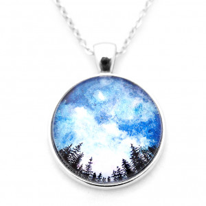 Piękny wisiorek z motywem skandynawskiego krajobrazu w metalowej oprawie w kolorze srebrnym. Krajobraz przedstawia las i rozgwieżdżone niebo.