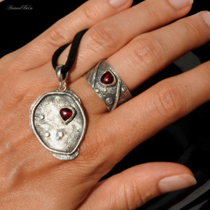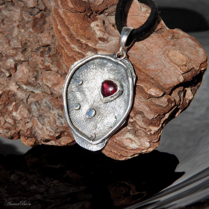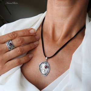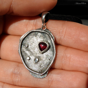 Wisiorek srebrny z granatem. Wykonany od podstaw ręcznie wisior powstał ze srebra próby 925 i 999. Srebro fakturowałam, oksydowałam (przyciemniłam) i przetarłam. Sercem zawieszki jest mała kropla granatu w kolorze czerwonego wina. Całość stanowi elegancką i nietuzinkową ozdobę pasującą do wielu stylizacji. Do wisiorka dołączam zamszowy rzemyczek w kolorze czarnym ze srebrnym zapięciem (próba 925) widoczny na zdjęciach. Waga wisiorka wynosi 4,3g. Długość wraz z krawatką to 40mm, szerokość 25mm. Technika wykonania: lutowanie, młotkowanie.