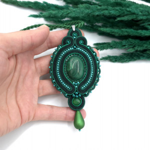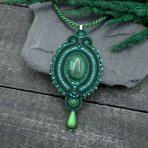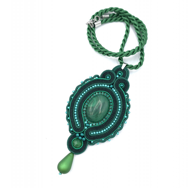 kaboszon malachit, kulka agatu, taśma z cyrkoniami, koraliki Toho, koraliki Round Beads, szklana kropla Drop Beads, sznurek skręcany, polskie i włoskie sznurki sutasz, zapięcie i krawatka ze stali chirurgicznej.