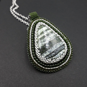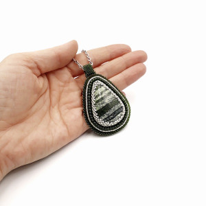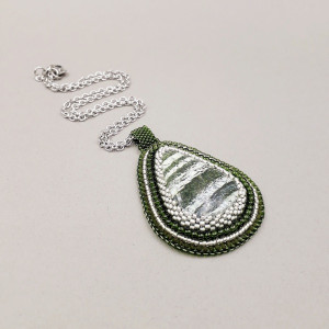 Wisiorek został precyzyjnie wykonany techniką haftu koralikowego, w 100 % wyszyty ręcznie. Kolory naszyjnika: oliwkowa, ciemna zieleń i kolor diamentu. Jego centrum to łza SWISS OPAL 39/27 mm, w piękne, mieniące się pasy, czego nia da się ująć na zdjęciu. Całość opleciona koralikami Toho. Wisiorek zawieszony został na łańcuszku ze stali chirurgicznej. Tył podszyty ciemno zieloną eko skórką. Elementy metalowe ze stali chirurgicznej w kolorze srebrnym.