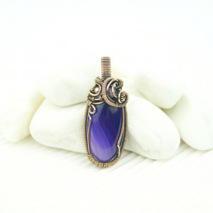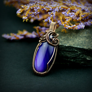Wisiorek powstał z agatu o intensywnej fioletowej barwie. W miedzianym oplocie widoczny złoty hematyt i mniejszy kamień agat. Biżuteria oksydowana.