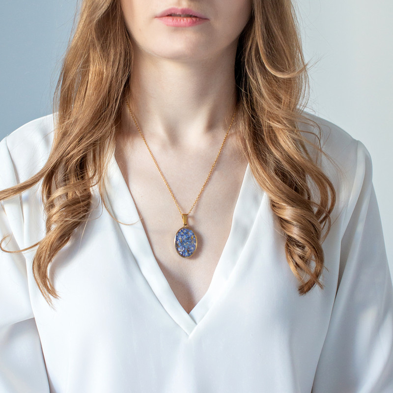 Wisiorek wykonany jest z żywicy epoksydowej z wykorzystaniem suszonych kwiatów. Metalowe elementy to stal nierdzewna szlachetna chirurgiczna.