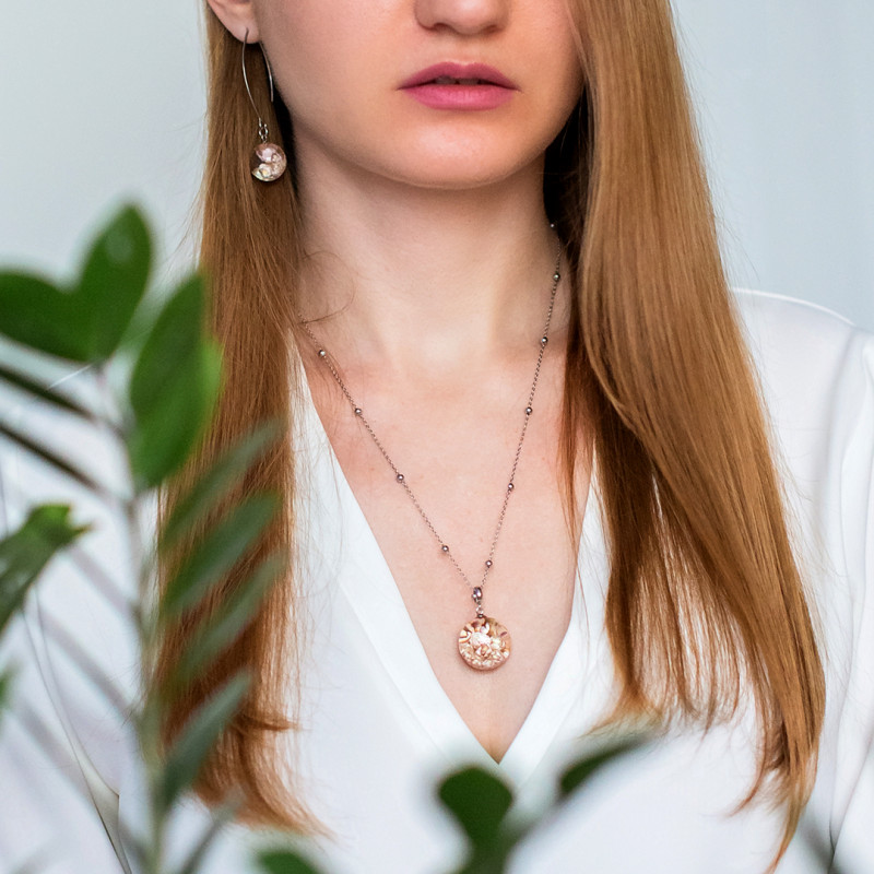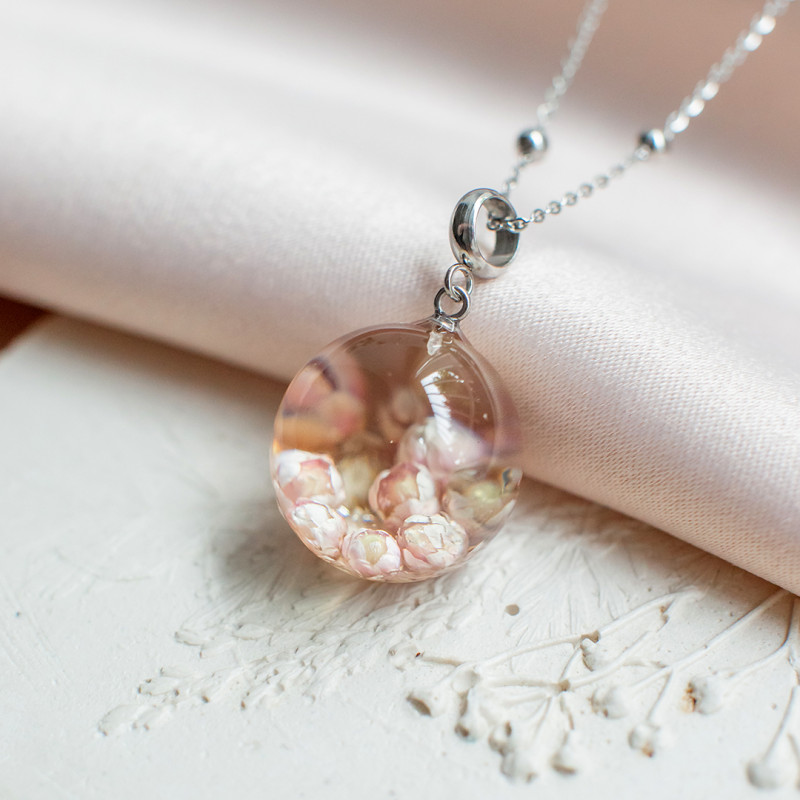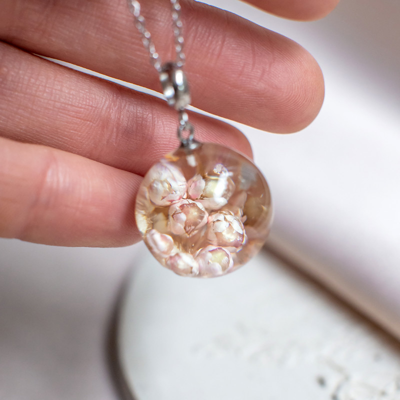 Wisiorek wykonany jest z żywicy epoksydowej z wykorzystaniem suszonych kwiatów. Metalowe elementy to stal nierdzewna szlachetna chirurgiczna.