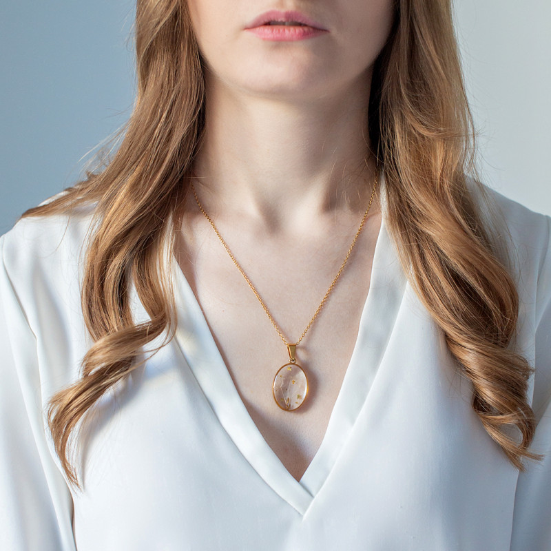 Wisiorek wykonany jest z żywicy epoksydowej z wykorzystaniem suszonych kwiatów. Metalowe elementy to stal nierdzewna szlachetna chirurgiczna.