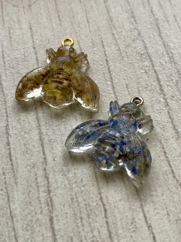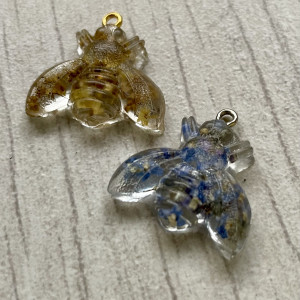 Wisiorek zawieszka pszczółka w kolorze niebieskim i wykończeniem w kolorze srebrnym. Z zatopionymi kwiatami niezapominajki.