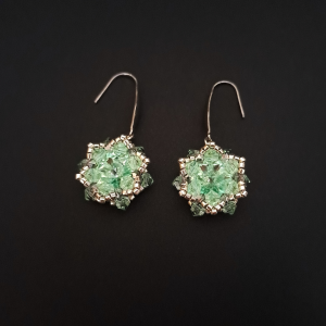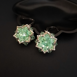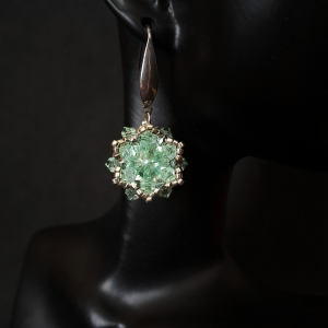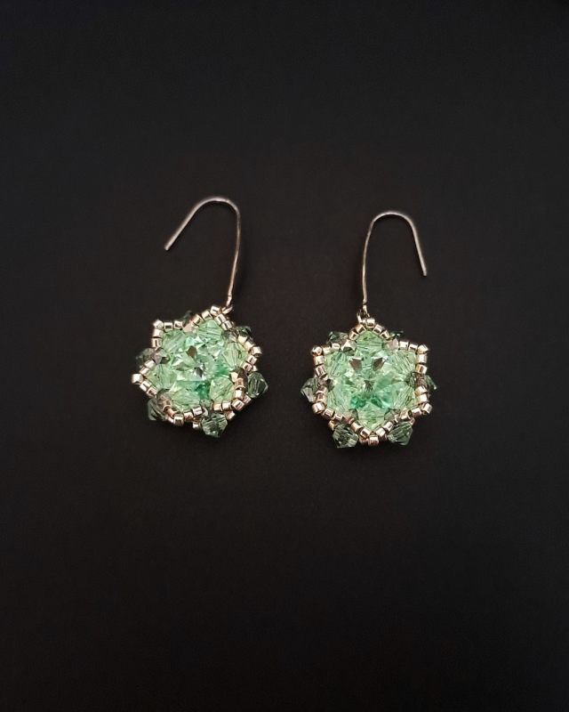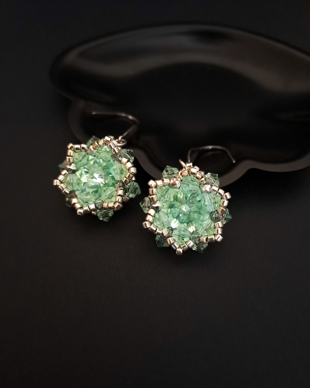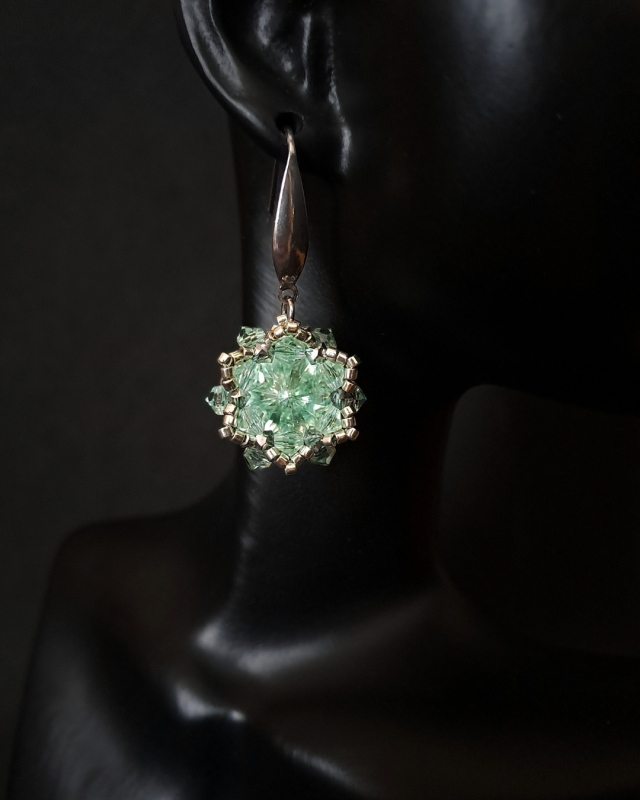 W centrum każdego kolczyka znajduje się kamień Preciosa Rivoli Maxima 12 mm w odcieniu chrysolite. Otulony jest błyszczącymi kryształkami Preciosa Bicone 3 i 4 mm w odcieniach labrador half oraz chrysolite, a całość dopełniają koraliki Miyuki Delica.Bigle wykonane są ze stali nierdzewnej, a całkowita długość kolczyków to ok. 4 cm - idealna, by subtelnie podkreślić linię szyi i ramion.