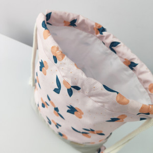 Worko-plecak wykonany z tkaniny wodoodpornej na zewnątrz i bawełnianej podszewki wewnątrz a całość ściągana jest bawełnianym sznurem.