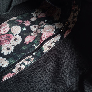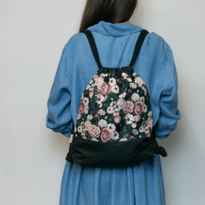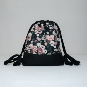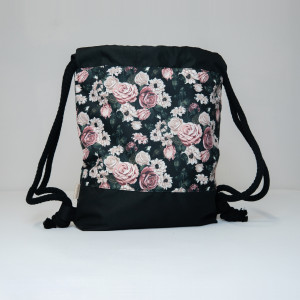 Czarny plecak ze wzorem róż i kwiatów został uszyty z wodoodpornej tkaniny.