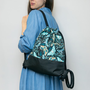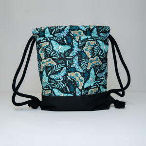 Czarny plecak ze wzorem turkusowych motyli został uszyty z wodoodpornej tkaniny.