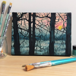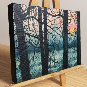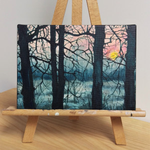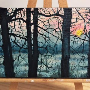 Ręcznie malowany przeze mnie, niewielki obraz akrylowy przedstawiający wschód słońca zimową porą, widziany z mojego okna.