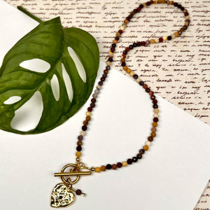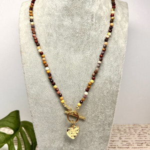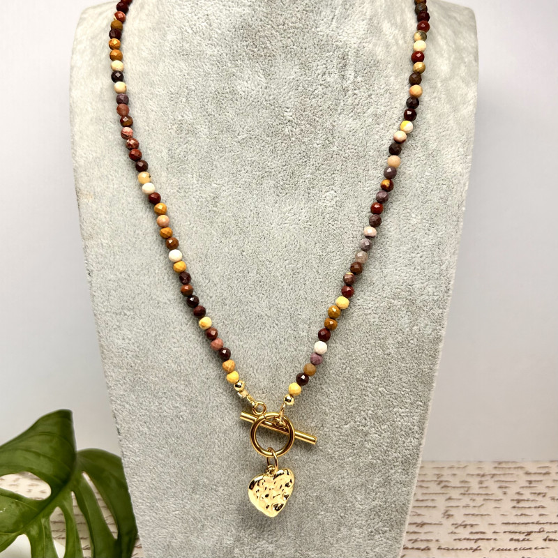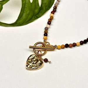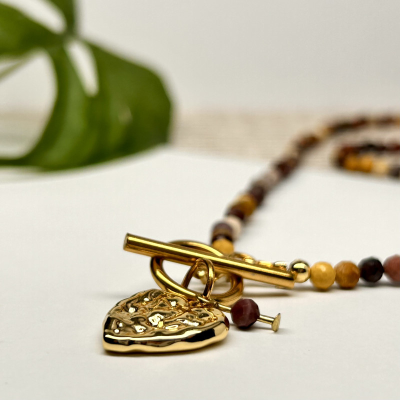 Kolekcja Wulka to połączenie naturalnej harmonii z nowoczesnym designem. Kolorowe kamienie mokaitu nawleczone na żyłce tworzą subtelną, ale wyrazistą biżuterię, której serce to zawieszka w kształcie serca ze stali nierdzewnej. Całość dopełnia zapięcie na przodzie, które dodaje funkcjonalności i elegancji.