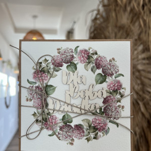 Kartka wykonana jest z najwyższej jakości starannie dobranych materiałów i dodatków w tym papieru kraftowego,bawełnianego w odcieniu śmietanki z nadrukiem stylowej grafiki oraz tekturkową ozdoba.