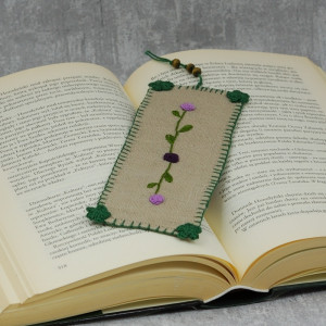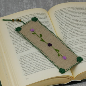 Zakładka do książki wykonana została z lnu, ozdobiona haftem.