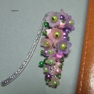 Zakładka do książki wykonana z metalowej bazy w kolorze srebrnym, akrylowych koralików w kształcie kwiatków i kulek, perełek szklanych, koralików spectra, drobnych koralików TOHO oraz metalowych elementów (szpilki, kółeczka i łańcuszek) w kolorze srebra. Wysokość zakładki: 8,6 cm. Długość przywieszki z kwiatkami: 7 cm.