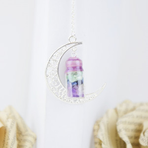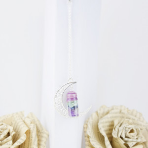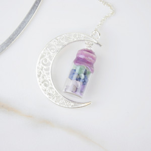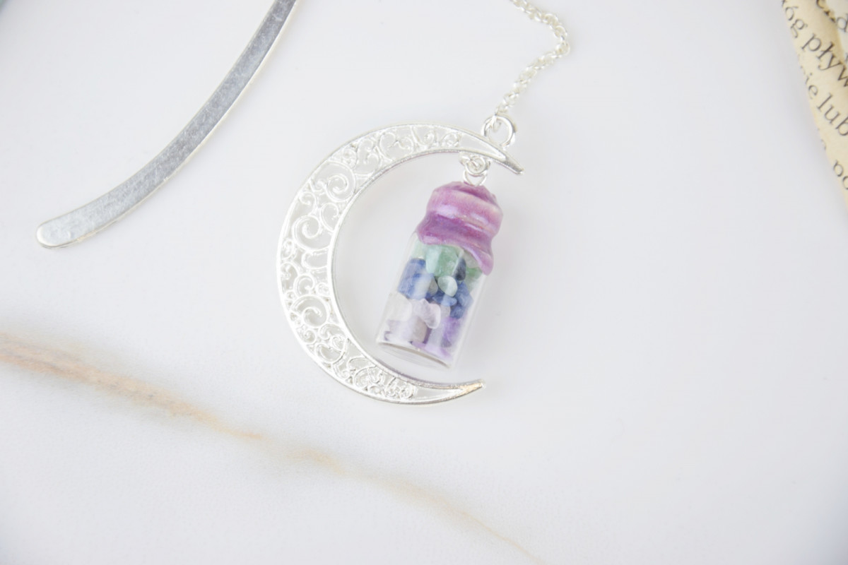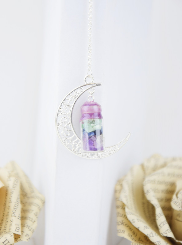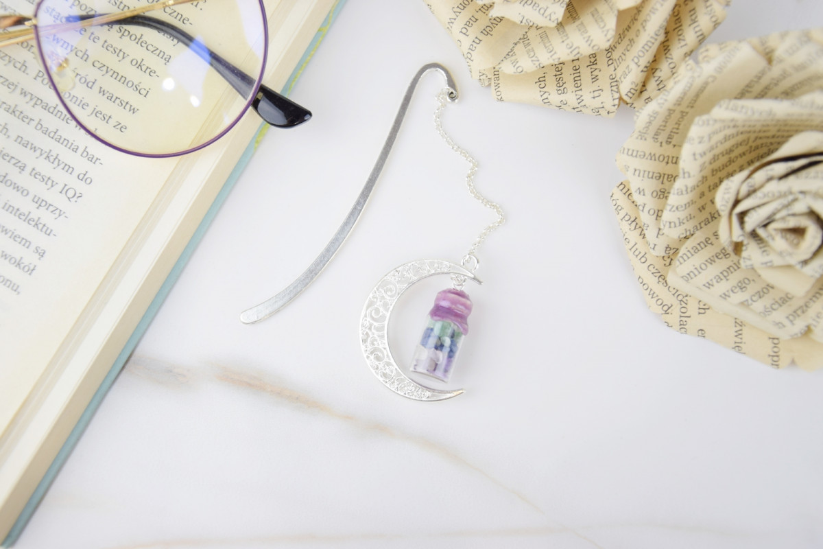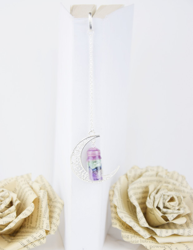Mam dla Ciebie ręcznie stworzoną zakładkę do książki. Metalowa zakładka prowadzi do dużego ażurowego księżyca w środku którego wisi zawoskowana buteleczka wypełniona minerałami.