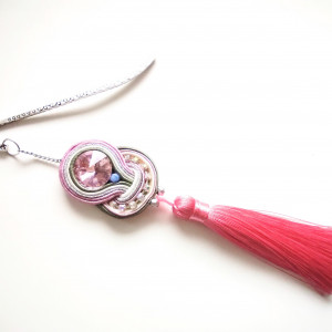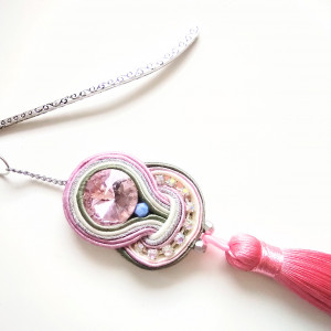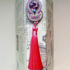Zakładka do książki wykonana w technice haftu sutaszowego - szyje się kolorowe sznureczki milimetr po milimetrze, wszywając między nie kamienie i minerały, szkło itp.