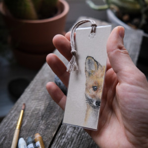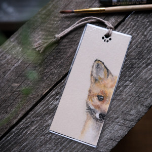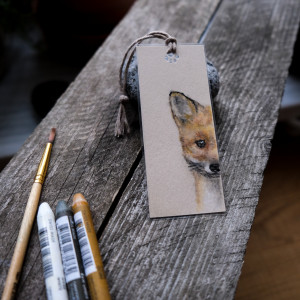 Akwarelowa zakładka do książki, ręcznie malowana farbami i kredkami z motywem rudego lisa prosto z lasu