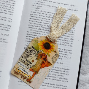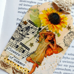 Ręcznie robiona zakładka do książki w motywie wróżki i słoneczników.