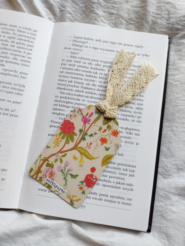 Produkt został wykonany metodą scrapbookingu. Stworzony z dbałością o każdy szczegół i miłością do rękodzieła. Zakładka jest dwustronna. Na tylniej części wykończona ozdobnym papierem oraz zawiera mój podpis. Wykonana na twardej tekturce.