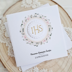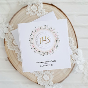 Zaproszenia Komunijne IHS różowy wianek