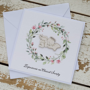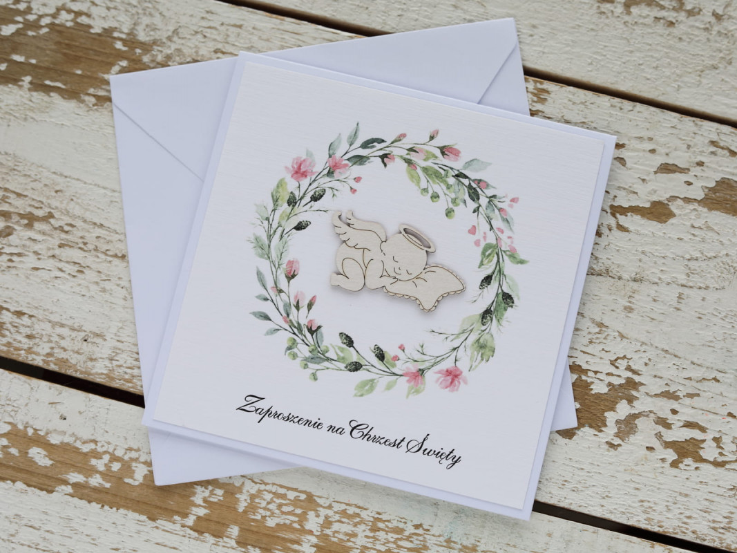 Zaproszenia na chrzest, kartka o wymiarach 14x14cm, wykonana z najwyższej jakości materiałów. Pełna personalizacja. W zestawie koperta. Cena za 1 szt. Dane do personalizacji proszę o umieszczenie w uwagach bądź przesłanie mailem. Tekst w środku do uzgodnienia.
