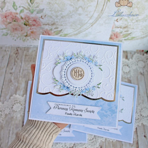 Piękne i eleganckie zaproszenia na Pierwszą Komunię Świętą, wykonane ręcznie z dbałością o każdy szczegół. Zaproszenia klejone warstwowo, dzięki czemu posiadają lekki efekt 3D, a centralny punkt stanowi przepiękny wianuszek oraz złocona tekturka przedstawiająca hostię świętą zdobione koronkowymi detalami. Całość dopełnia błyszczący, srebrny papier lustrzany oraz drukowany napis. Środek zaproszenia w pełni personalizowany, można podać własny tekst do wydruku lub wszelkie niezbędne dane, a ja ułożę je w tekst.