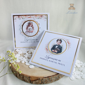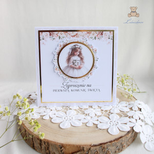 Niezwykle delikatne i eleganckie zaproszenia na Pierwszą Komunię Świętą, wykonane ręcznie z dbałością o każdy szczegół. Zaproszenia klejone warstwowo, dzięki czemu posiadają lekki efekt 3D. Centralny punkt zaproszenia stanowi przepiękna, grafika dziewczynki w stroju komunijnym, otoczona wianuszkiem z brzoskwiniowych kwiatów. Całość dopełnia papier scrapowy w odcieniu nude oraz błyszczący, złoty papier lustrzany, a także nadrukowany napis "Zaproszenie na Pierwszą Komunię Świętą" (istnieje możliwość nadrukowania również imienia dziecka - w tym celu proszę o kontakt).
