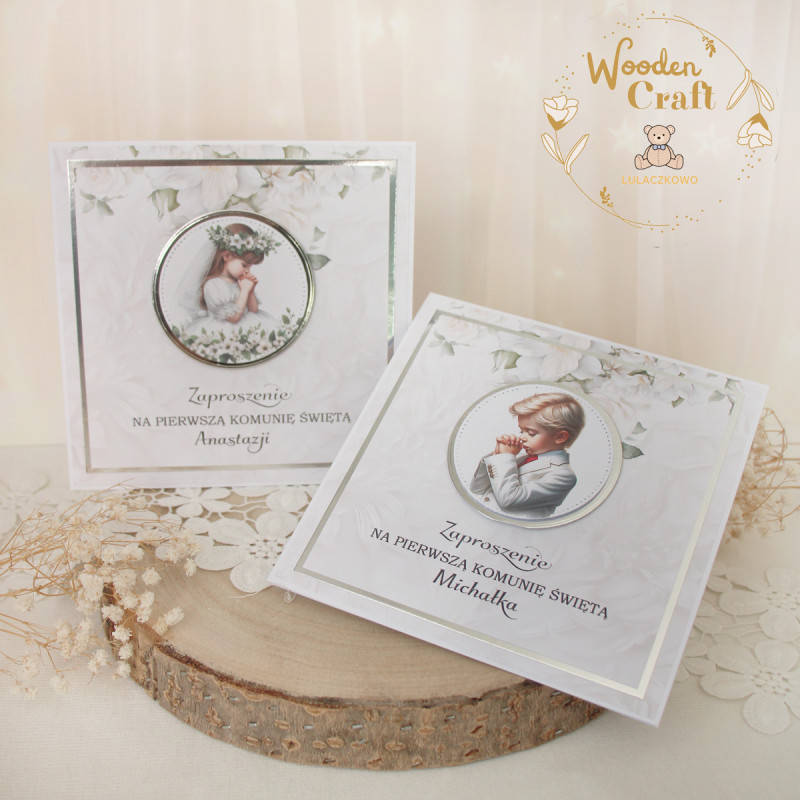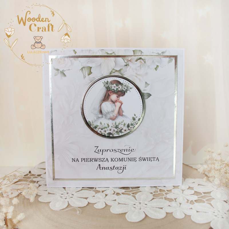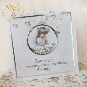 Niezwykle delikatne i eleganckie zaproszenia na Pierwszą Komunię Świętą, wykonane ręcznie z dbałością o każdy szczegół. Zaproszenia klejone warstwowo, dzięki czemu posiadają lekki efekt 3D. Centralny punkt zaproszenia stanowi przepiękna, grafika dziewczynki w stroju komunijnym, otoczona srebrną, błyszczącą, okrągłą rameczką. Całość dopełnia papier scrapowy w odcieniu bieli wpadającej w lekki beż oraz błyszczący, srebrny papier lustrzany, a także nadrukowany napis "Zaproszenie na Pierwszą Komunię Świętą" (istnieje możliwość nadrukowania również imienia dziecka - w tym celu proszę o kontakt).