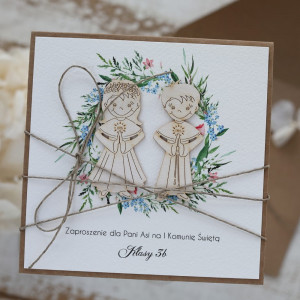 Zaproszenia komunijne, kartka o wymiarach 14x14cm, wykonana z najwyższej jakości materiałów eko. Całość przewiązana lnianym sznureczkiem. Pełna personalizacja. W zestawie brązowa koperta. Cena za 1 szt. Dane do personalizacji proszę o umieszczenie w uwagach bądź przesłanie mailem. Zapraszam