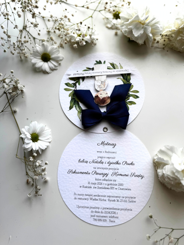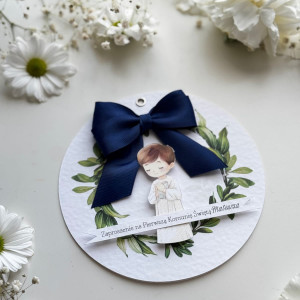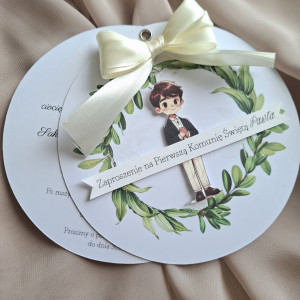Na przodzie nadruk wianka, postać chłopca naklejona przestrzennie i kokardką z satynowej wstażki.