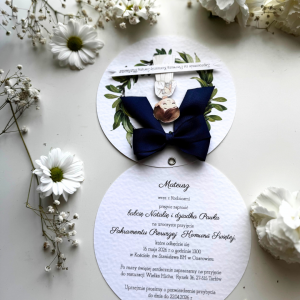 Urocze okrągłe zaproszenie z kokardką zauroczy Waszych gości.