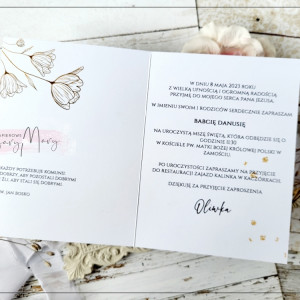 Do zaproszenia polecam w tym samym zestawie kolorystycznym winietki, podziękowania dla gości z czekoladką, zawieszki lub naklejki na ciasto, księgi gości.