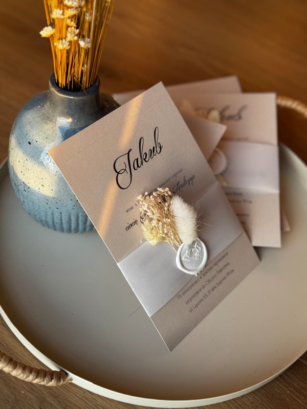 Delikatne zaproszenie na I Komunię świętą z suszonymi kwiatami i lakiem
