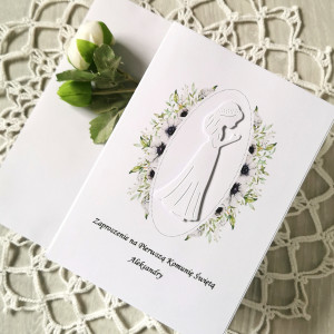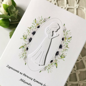 Delikatne zaproszenie na Pierwszą Komunię Świętą z kwiatową grafiką i motywem dziewczynki.